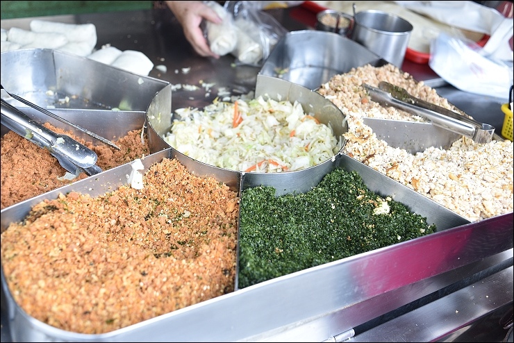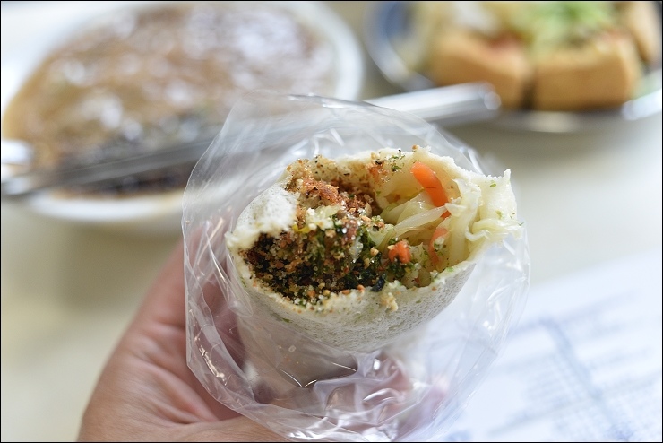 夾在麵線糊和臭豆腐中間攤位的忠孝潤餅也來一捲!餐餐重油重鹹,想補點青菜就靠這捲,除了蛋酥花生粉之外,潤料料還多了海苔,可能是因為老板要包潤餅不想碰錢,這間是採自己結帳找零喔!