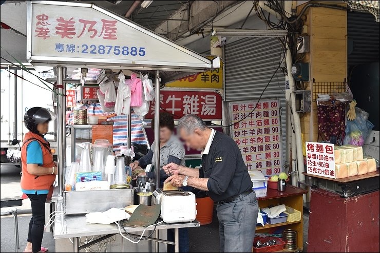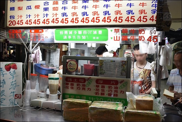 終於又逛到忠孝夜市的尾端啦!另一端有豆花配刈包,這端有木瓜牛奶配烤土司,好妙!對街的忠孝美乃屋和清心水果牛乳大王都有網友推,這個當點心宵夜早餐都很適合啊。