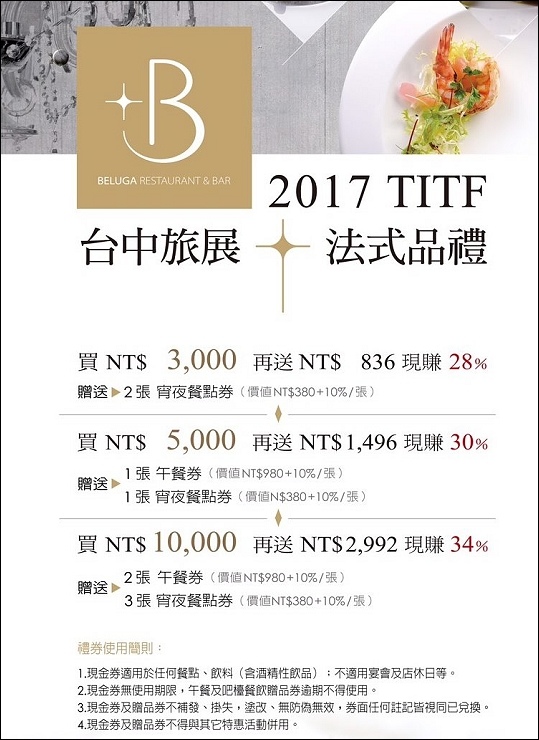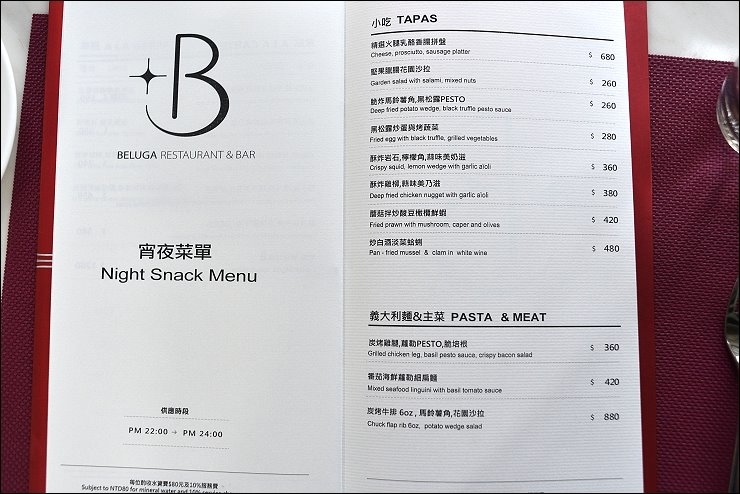 雖然台中3天2夜輕旅行的二大主軸是一中夜市商圈和忠孝夜市美食街,但在夜市美食吃透透的中場休息時間,我們還是偷偷安插了「Beluga restaurant&bar法式餐酒館」,低調的享受一下台中七期的隱藏版泳池畔高檔料理,正在成長期戰力十足的允嘉大哥說這間通通都好吃,但份量再多點會更完美啊!出社會辛苦賺錢養家那麼多年,平日家裡開伙或是巷弄小吃就很滿足之外,偶爾還是要犒賞自己放鬆享受一下人生。
