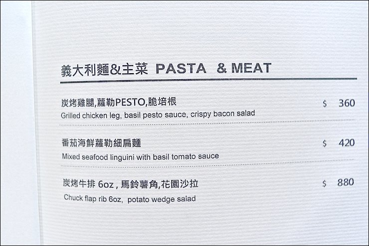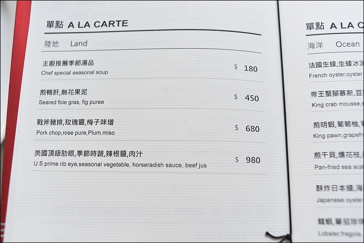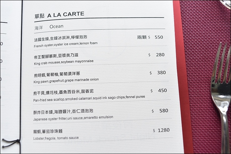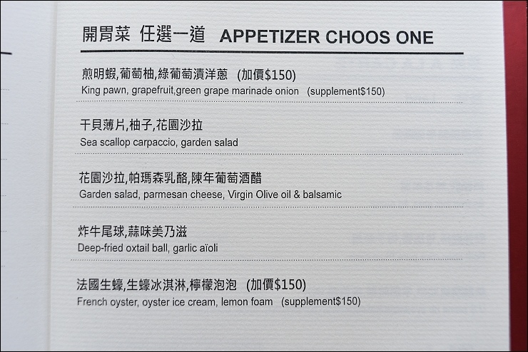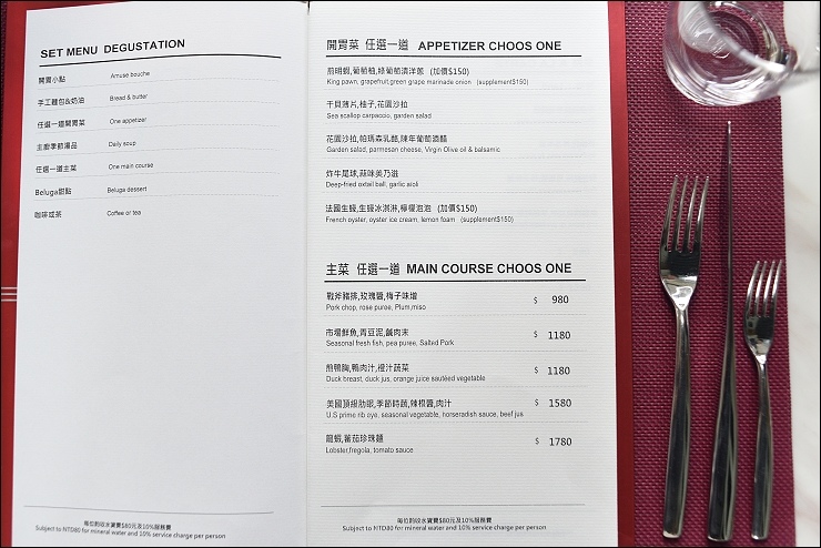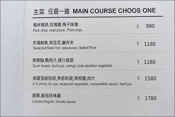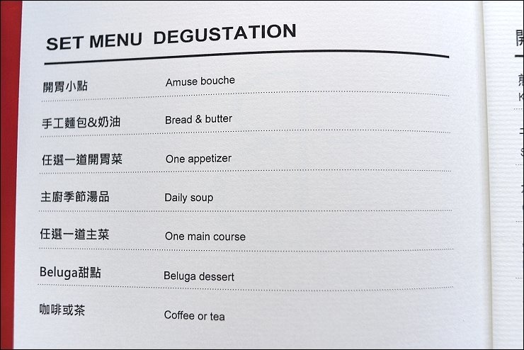 午間商業套餐價位從980~1780元,包含開胃小點、手工麵包&奶油、開胃菜、主廚季節湯品、主菜、Beluga甜點、咖啡或茶。