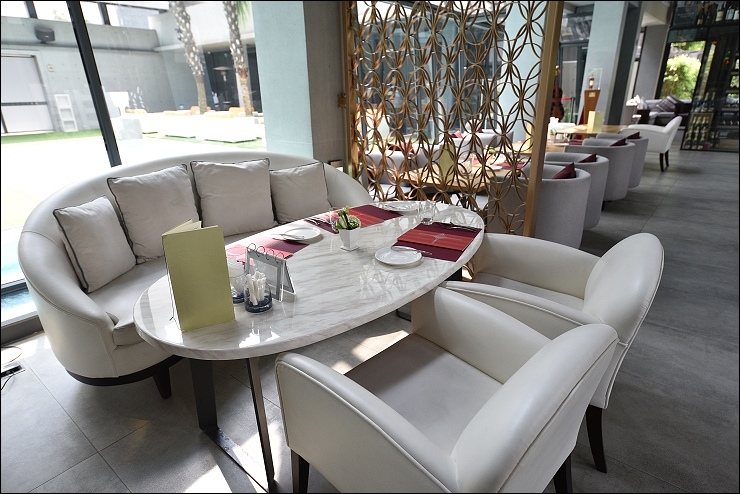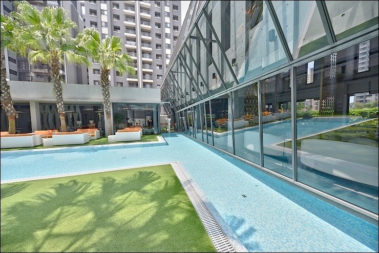 明亮高雅舒適的櫃台候位區,帶位人員的服務熱忱有禮,外面的泳池是真的可以游泳喔,只是現在尚未開放。