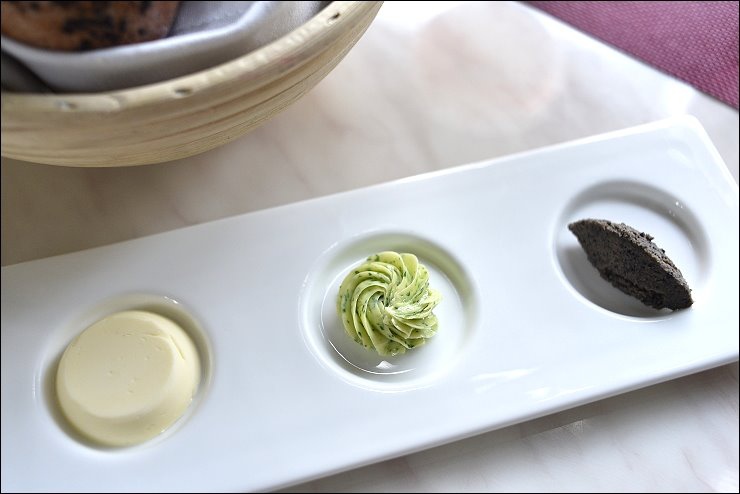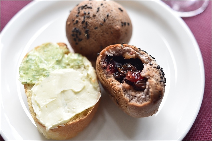 法國白桂跟蔓越莓麵包;沾醬原味奶油、香蒜跟鮪魚黑橄欖,內餡蔓越莓多到爆出來,好吃到想加點!麵包吃不夠可以再續,要不是怕待會主餐吃不下,真想再塞一顆蔓越莓麵包。