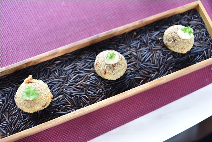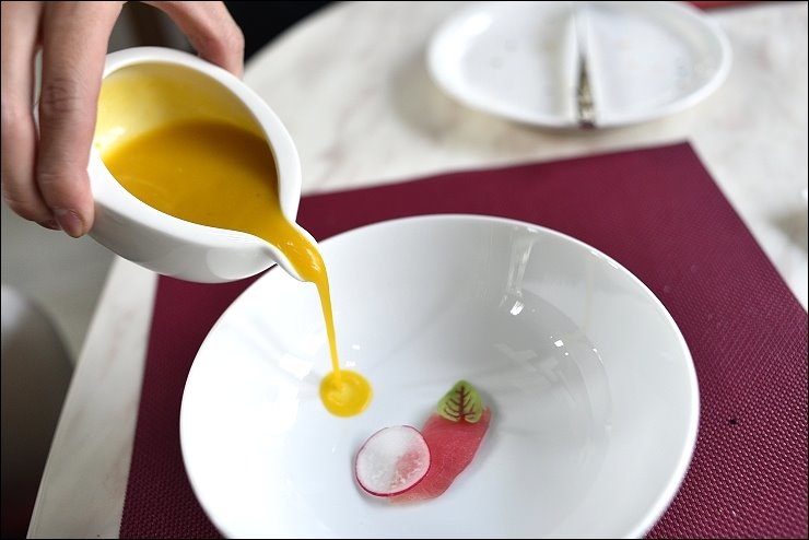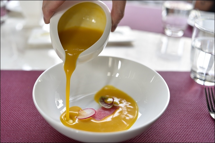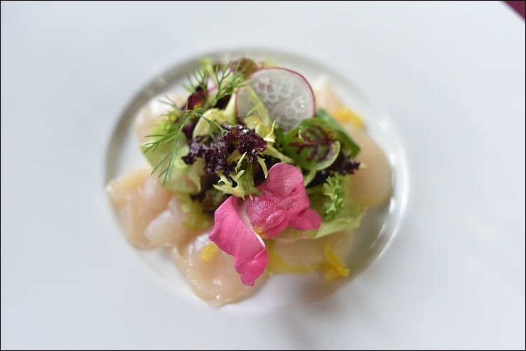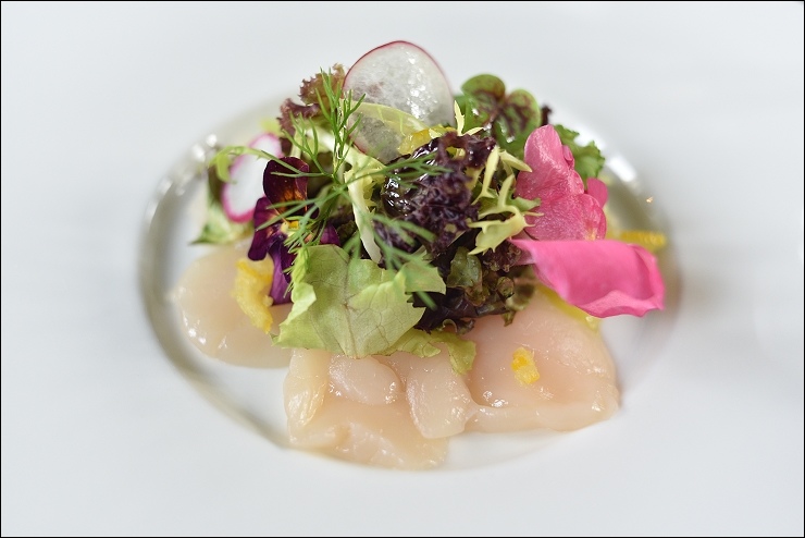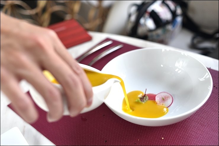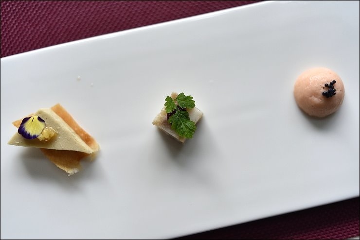 由右至左分別是鴨肝慕斯脆餅、豬頭皮做的蒟蒻凍、鮭魚慕斯,這一小口的份量吃巧不吃飽,感覺大人比較吃得出門道,允嘉哥搖搖頭。