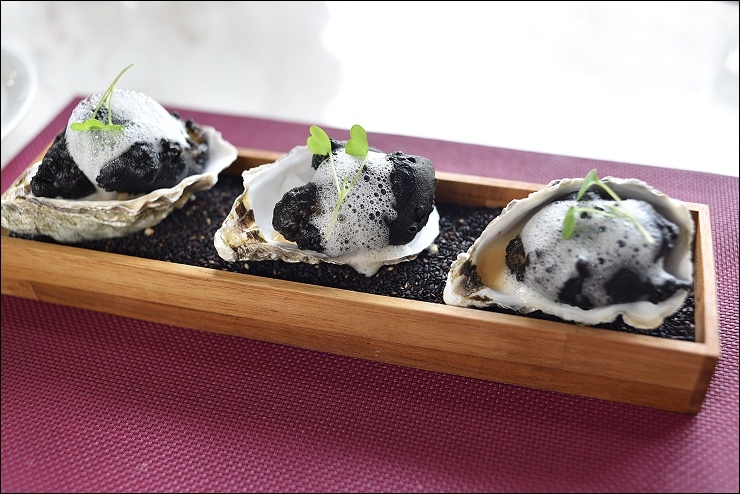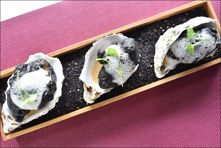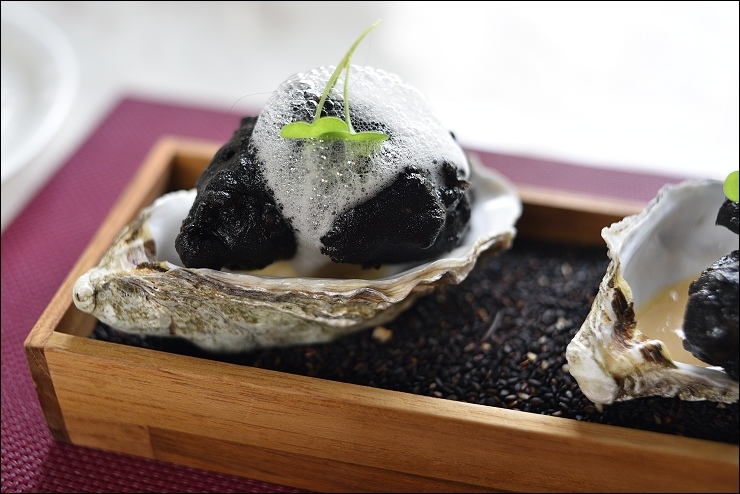 這是小鮮肉店員推薦的單點日本生蠔:有墨魚麵衣+檸檬泡泡+海膽醬汁, 外酥內嫩,這個允嘉哥馬上讚好吃!記得要趁熱吃,直接用手拿就對啦。