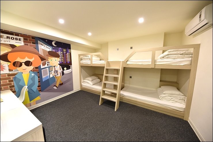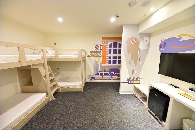 七樓的家庭四床房,適合喜歡自己睡一張床的家庭成員,房間走年輕都會的彩繪風,每間牆面彩繪都是卡通故事風,可以跟小朋友看圖說故事。