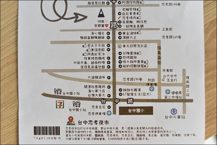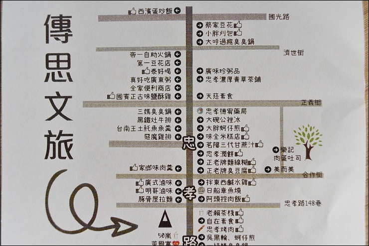 傳思文旅的服務人員同樣走年輕化,除了提供台中商圈地圖之外,也提供客人在地或是深度的台中小旅行程諮詢,有了傳思的忠孝夜市美食地圖,基本上完全不用再作行前功課或GOOGLE必吃美食,根據我們當天下午和晚上的3,4回合實戰,地圖上有按讚的都不太會踩雷,當我們還有加碼網友在FB留言推薦的忠孝路必吃美食,像是清心&美乃屋木瓜牛奶加土司、祥嘉義米糕和遠一點的靜宜早點~~後面會整理出來提供大家參考。