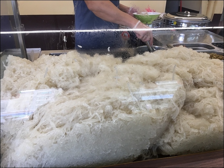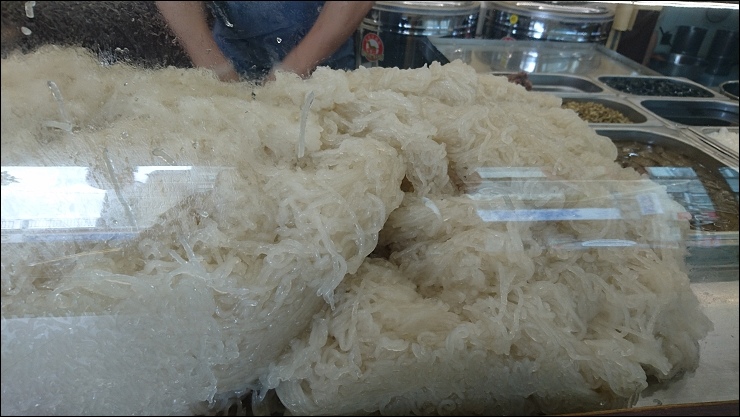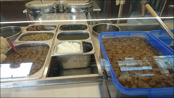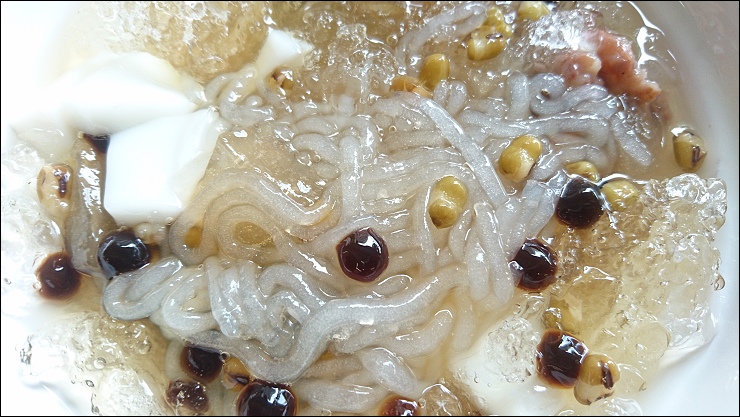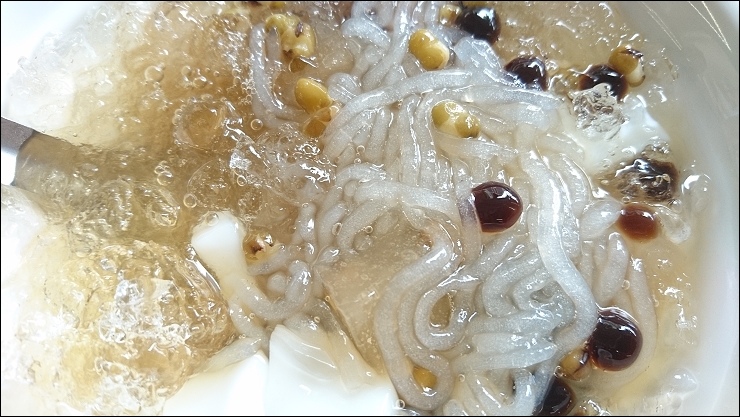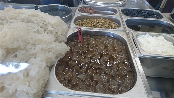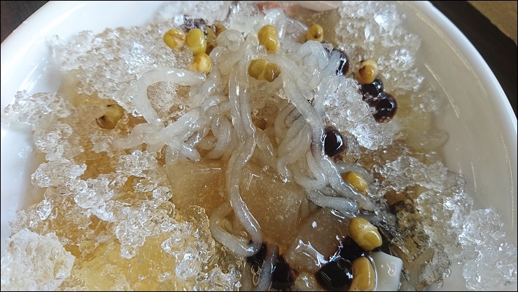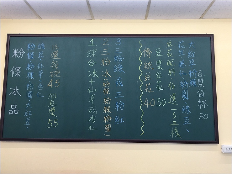 我們家幾年前吃還是一碗35元,後來小漲5元來到一碗40元的價位,現在店面漲到45元啦!粉條冰的配料有花豆、綠豆、粉粿、粉圓、仙草和杏仁(要指定),不限樣任選,可以直接點綜合,然後杏仁要另外指定。