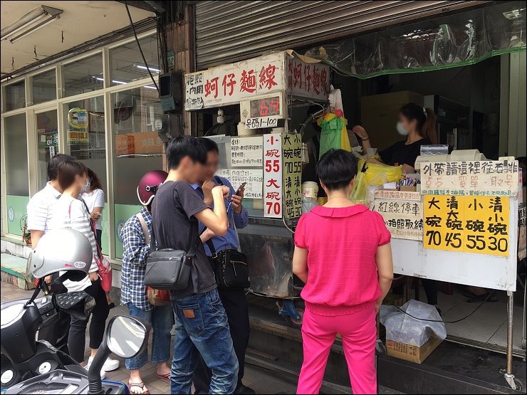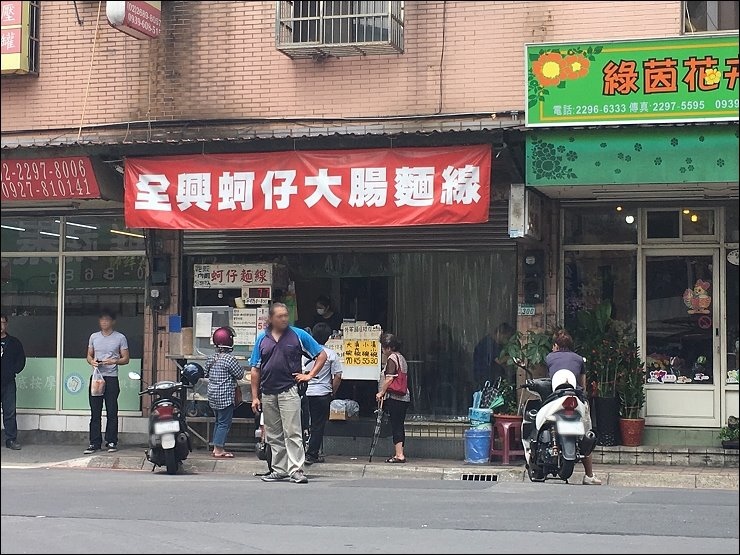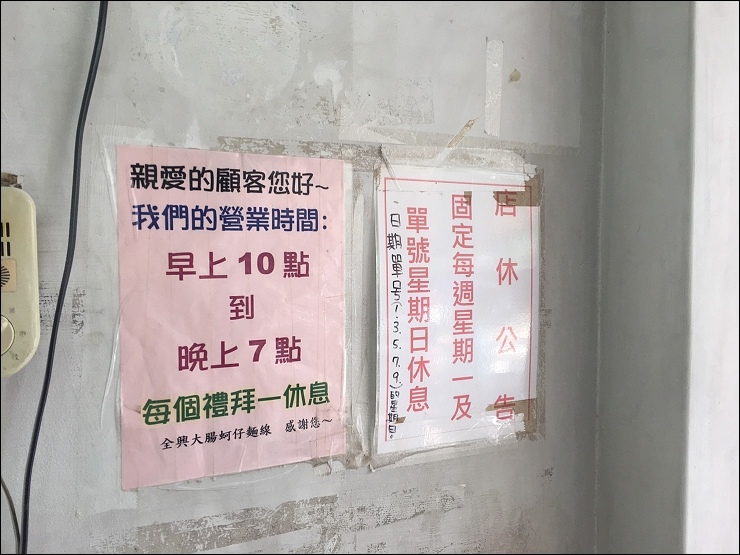 這間全興大腸蚵仔麵線應該是泰山最有名的排隊美食,賣麵線賣到開發票,然後內用外帶人潮一左一右分二排,我們大約11點半到,內用小小排隊中,外帶雖然看起來沒人排,但老板會給號碼牌,然後至少要等四十分鐘才能消化前面的訂單,鳥大叔當場決定改變用餐順序,先轉進粉條冰再來外帶麵線。
