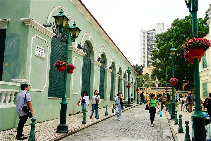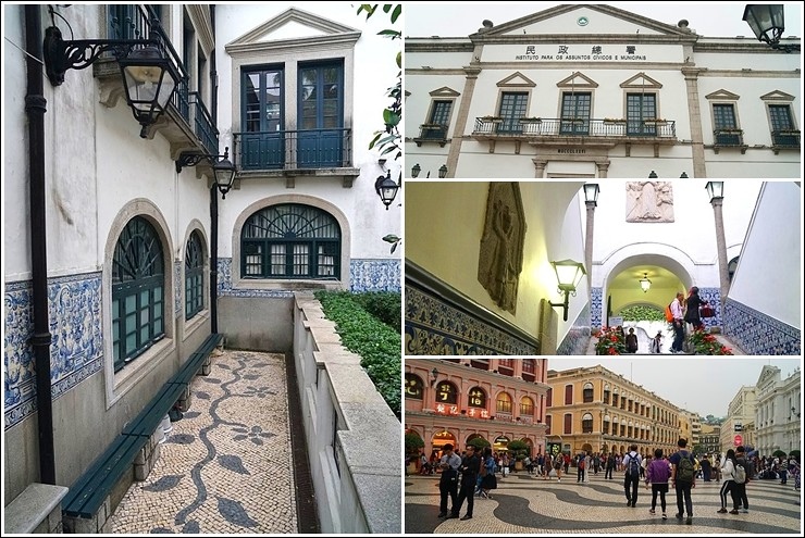 走著走著就走到民政總署大樓及議事亭前地啦,大樓內的牆上嵌有很多具歷史價值的石雕,彷彿訴說著澳門數百年來的歷史,二樓設有會議室及圖書館,中庭有個葡萄牙風格的花園,不過我們去的時候剛好在整修中,很多人會在議事亭前地的噴水池旁坐著休息,這裡是澳門四大廣場之一,四周充滿葡萄牙風味的歐式建築,很多都被列為歷史文物保留建築,黑白相間坡浪型的葡石地磚好吸睛,彷彿行走在浪花之上,聽說這裡不定時會有一些表演,瑪格說如果傍晚藍調走在這裡超美的,會以為自己來到某個歐洲小鎮~~
