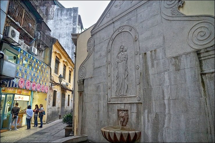 大堂街炸雞往前直走沒多久就看到另一個噴水池,瑪格說這是她最喜歡的噴水池,人潮明顯沒議事亭前池那麼洶湧,反顯幽靜舒服,其實來到澳門很適合在巷弄中亂走去發現自己喜歡的角落,行走中會遇到很多好吃的老店或奇妙的小店,心情放輕鬆去試試,搞不好收穫更多,最後來到美麗鵝黃色外牆,十八世紀巴洛克式裝潢的玫瑰堂,裡面收藏了超過300件澳門天主教珍貴文物,2005年被列入世界文化遺產,可惜我們到時已經過了入場時間,聽說天花板、窗櫺上隨處都有很精細的雕花。