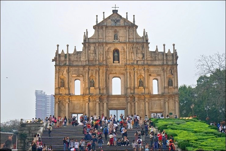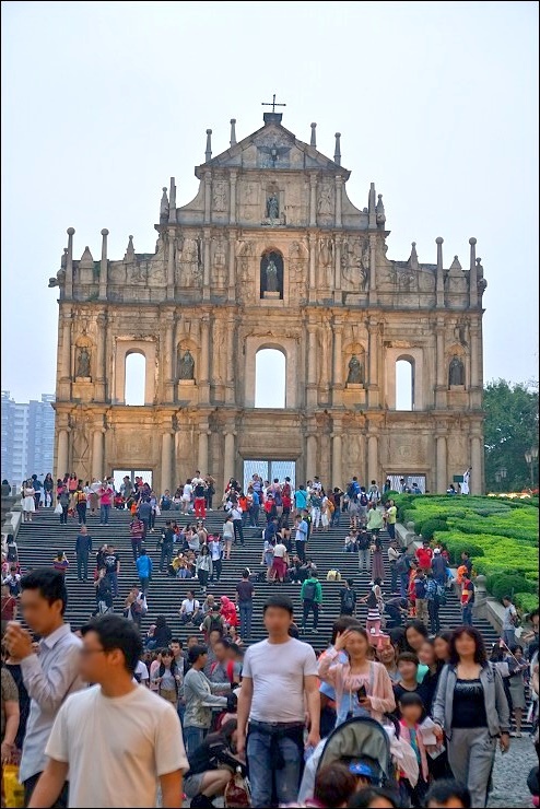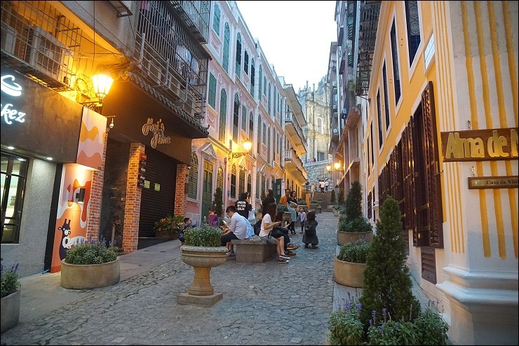 沿著老街走到底就是來到澳門必訪的大三巴牌坊,是澳門的指標性建築物,以精緻的浮雕和銅像著稱,原名為聖保羅大教堂遺址,歷經三次祝融,目前倖存教堂前壁,因遺存的教堂壁址外型酷似中國傳統牌坊,故被當地人稱為「大三巴牌坊」,可惜這天天色陰暗灰濛,小虎說他上次藍天來時拍很美,泣!大三巴牌坊附近有一條粉紅色與鵝黃色葡式建築外牆相映照的戀愛巷,是澳門最時興的唯美景點,常有電影及電視劇在此取景。