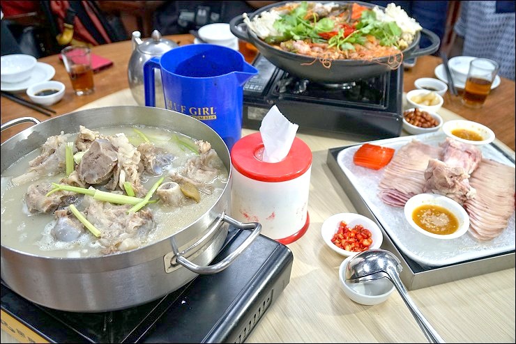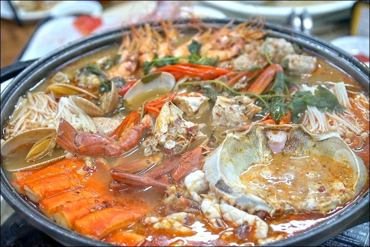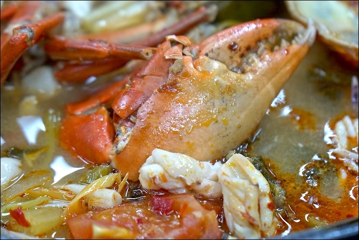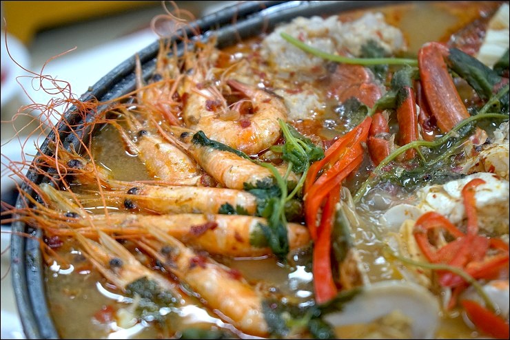 尤其是那兩鍋湯,一個濃鮮甘醇、一個酸中帶勁,兩鍋我都各喝好幾碗,整個快變水桶。凱莉哥一直問我台灣那裡喝得到這種以豬大骨、雞翅、冬瓜等蔬菜一起煲,既混濁濃厚又帶有白胡椒香,實在夠味,殊不知人家有來台灣開分店,只是不合台灣人的口味被迫收起來了-_-|||,應該通知我們的啊。另外那道有點泰又不是很泰的泰式海鮮鍋有放客家鹹菜進去欸,同桌的料理達人偉強師父還傳授放酸梅就不用放醋的撇步,我旁邊的海鮮控(某哥)又吃的速速叫,好險這晚沒有小金主管來突擊