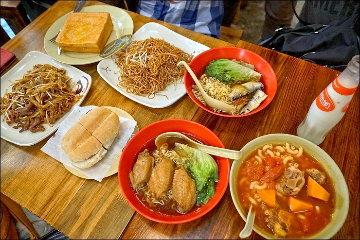 最後一天離開前,Sandra特別叮嚀我們不要吃飯店的早餐,她要帶我們品嘗在地的茶餐廳,其實她大可不必提醒我,因為我沒一天起床吃早餐的啦,哈哈!這家青洲灶記咖啡店址前身好像是另一家名店大利來記,也是豬扒包名店,還好最後一天有在青洲灶記吃到澳門名物豬扒包,不然又要創紀錄了啦> <!我們點了滿滿一桌,鮮茄牛尾通心粉、雞扒麵、辣魚麵都是在地人愛吃的。
