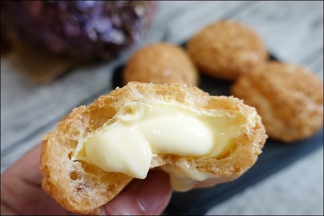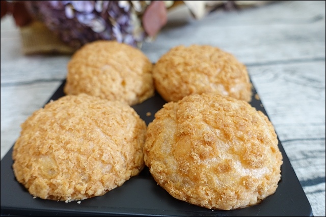 菠蘿泡芙4顆55元,有時特價49元更划算。不加熱涼涼的吃,外皮軟趴趴是敗比,好在內餡爆漿美味加分,外皮能做出酥脆度就太好了。