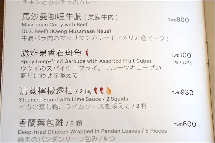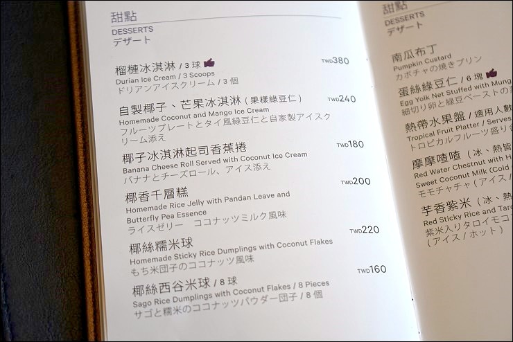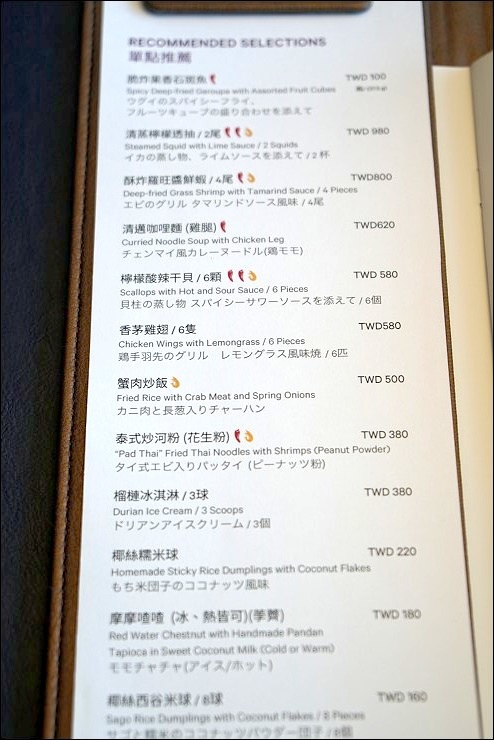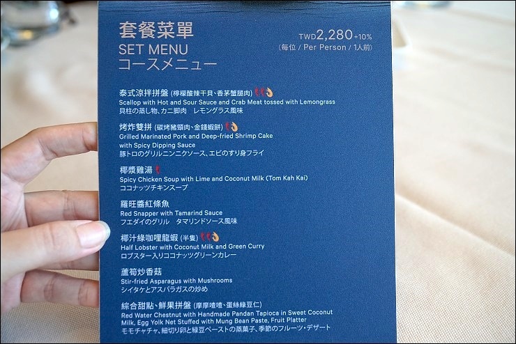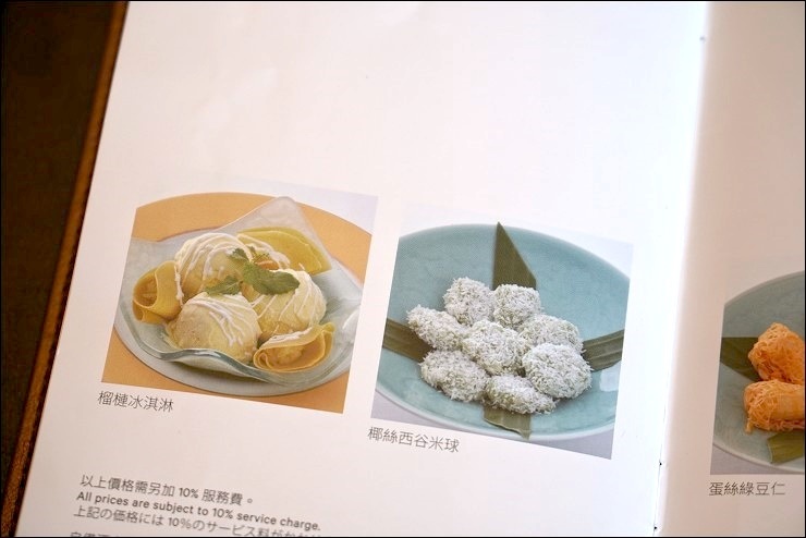 除了單點,也有套餐菜單,不過感覺上份量蠻多的,是說一開始照套餐的建議菜色點就對了啊,有涼拌、烤炸、湯品、魚、咖哩、菜跟甜點,這樣既平衡又不致口味或調理方式上太偏,我絕對是豬頭來著(果然是大傻無誤),下次點菜要好好改進才行XD。對了,這裡另有壽星專案,生日當天來用餐,贈送壽星本人一份泰式甜點。