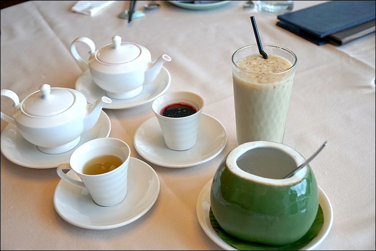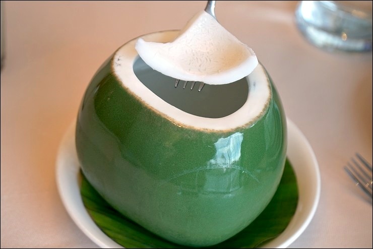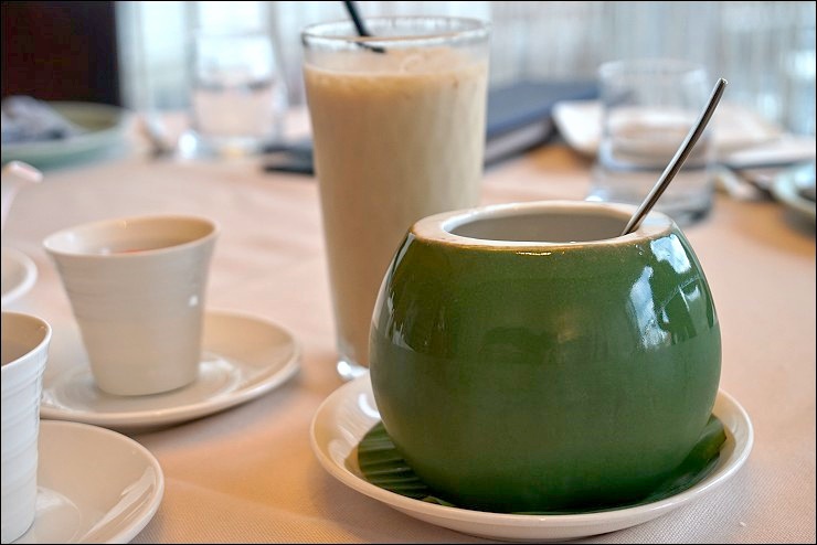 上菜之前先喝飲料潤潤喉,兩杯熱的、兩杯冷的,上一輩都點養生的熱飲,怕熱的年輕人猛灌冷飲,哈!這裡的椰子汁雖然沒有用真椰子裝盛,但特製的容器也很有質感,椰子汁清涼解渴,椰子肉也好吃!泰式奶茶不會太甜,我輕輕鬆鬆就解決完一大杯,還有點喝不夠哩,阿母的香茅蜜茶也不錯,做冰的我應該會更愛:P