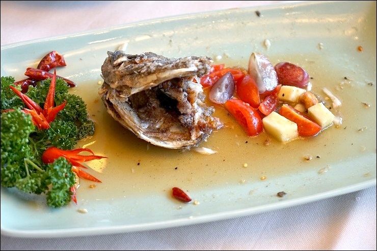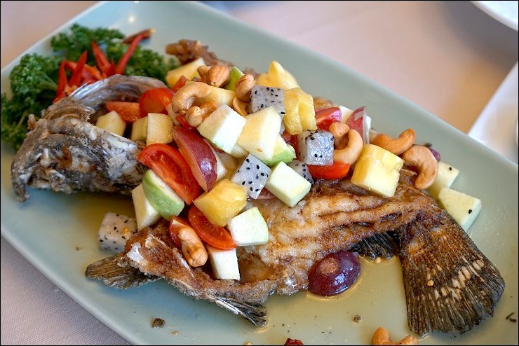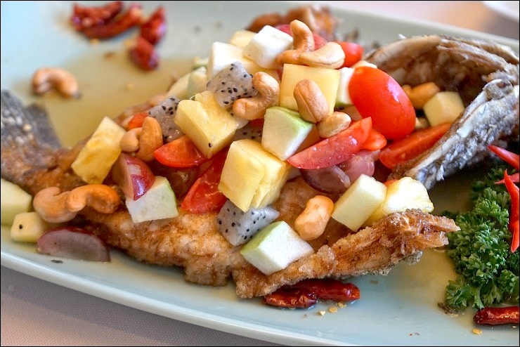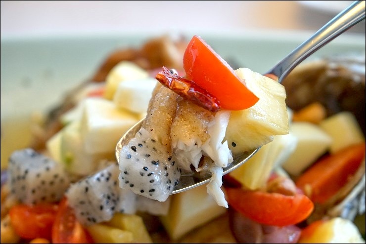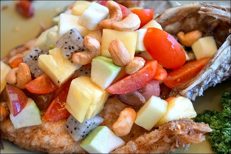 脆炸果香石斑魚是當天阿母最愛的一道,將水果切丁當配菜襯炸魚意外好搭!尤其在炙熱的夏天將魚肉與各種不同口感不同甜度的水果一起入口相當開胃喔!