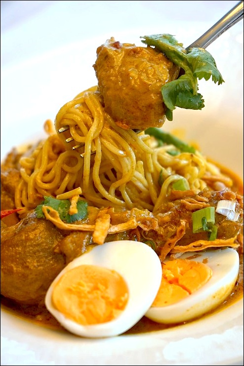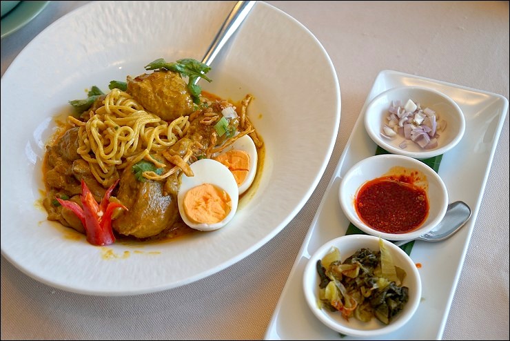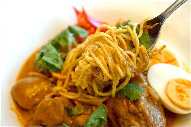 這道清邁咖哩麵也是很殺,先將椰奶以中火煮至濃稠狀,再加入黃咖哩和薑黃粉拌勻攪炒至香味濃厚,以此醬汁用大火拌炒雞腿至上色,再以魚高湯、魚露、胡椒鹽等調味,吸飽醬汁精華的油麵也是重點,除了麵條、雞腿還有一顆切半的溏心蛋,飽足感十足。