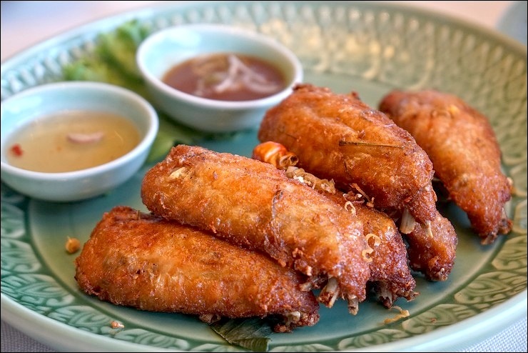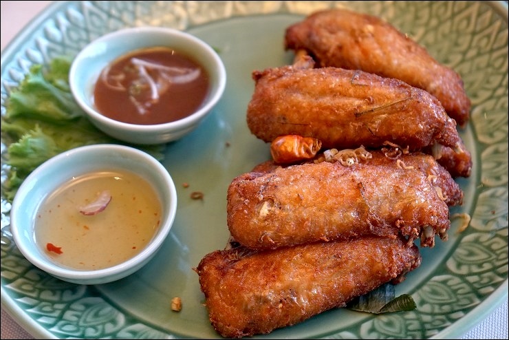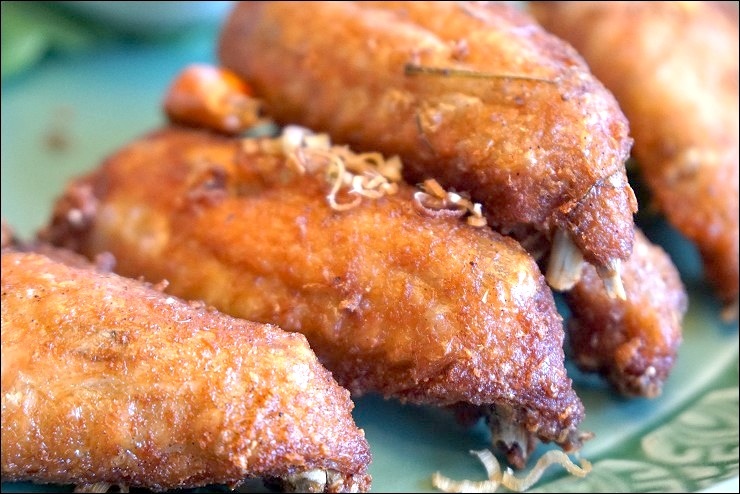 這也是後來加點的香芧雞翅,怎麼都是炸物,我一定是瘋了(抓頭),還好只有上半節翅,一人一小根當塞牙縫,哈哈!單吃就很有味道了,利用泰國魚露、白胡椒、糖及香茅去醃了一晚,根本不需要沾附上來的羅旺醬及糖醋醬。