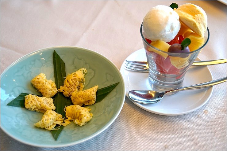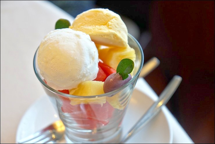 雖然肚皮都澎起來了,還是不免俗的叫了甜點來個完美收官,原本服務人員是推薦榴槤冰淇淋,但我跟阿母都不敢吃榴槤,於是改點蛋絲綠豆仁跟自製冰淇淋,綠豆仁size真的超迷你,一口就可以下肚,姐妹覺得特別,至於兩款冰淇淋口味我愛椰子冰淇淋更甚芒果,底下又襯了水果,加上午餐那條魚上面的水果丁,今天水果補充量有達標!