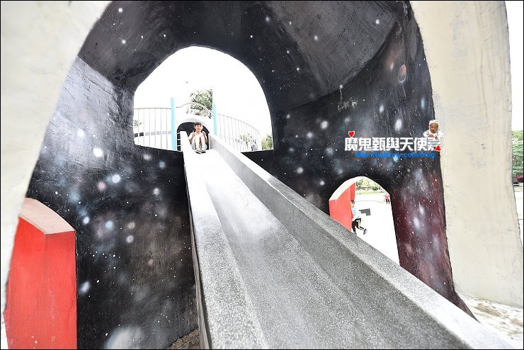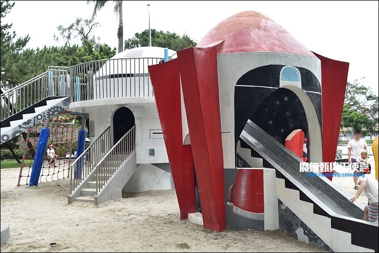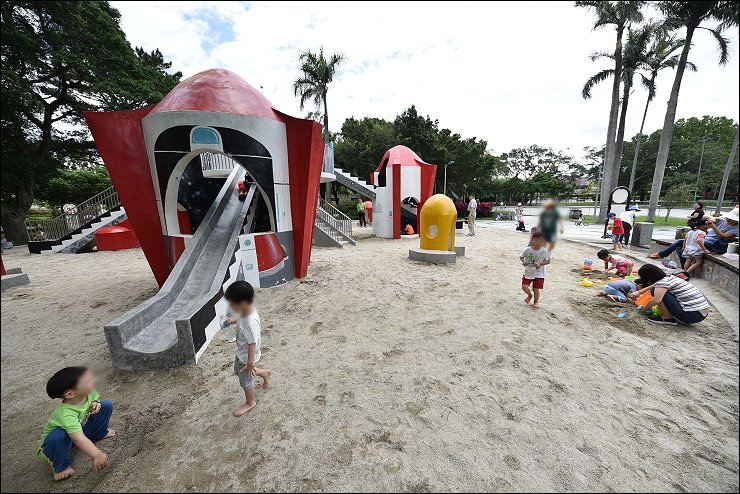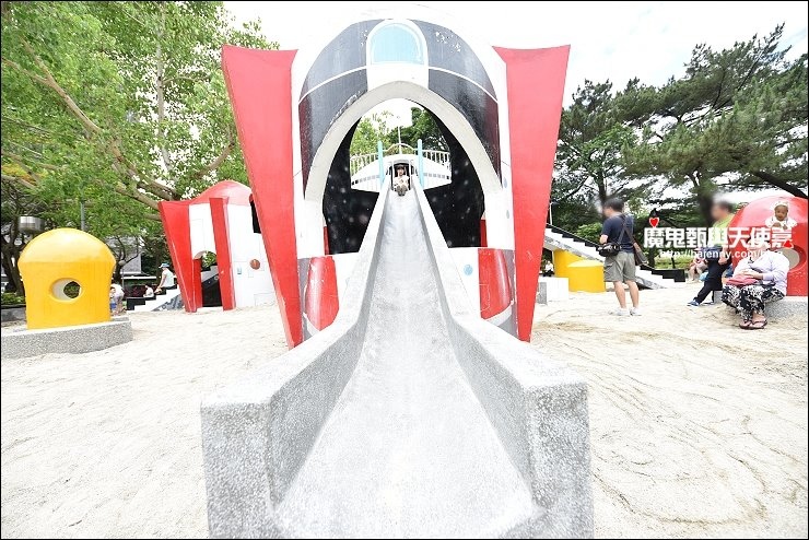 超熱門的太空堡壘溜滑梯,溜滑梯的每個出口都是沙坑區,旁邊的雙水龍頭立柱水量奇大,好沖好洗小孩出來玩就不要怕髒囉~~