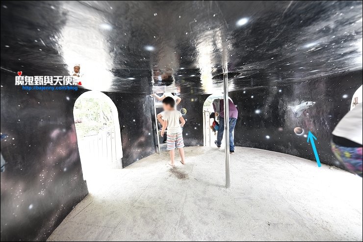 太空艙穹頂內部有星空和太空梭等彩繪,再往上爬就可以從外太空直接溜到地球上的沙坑啦!