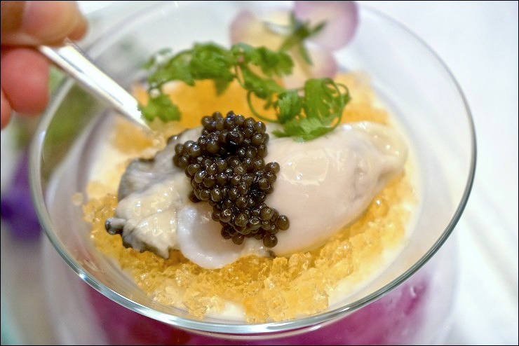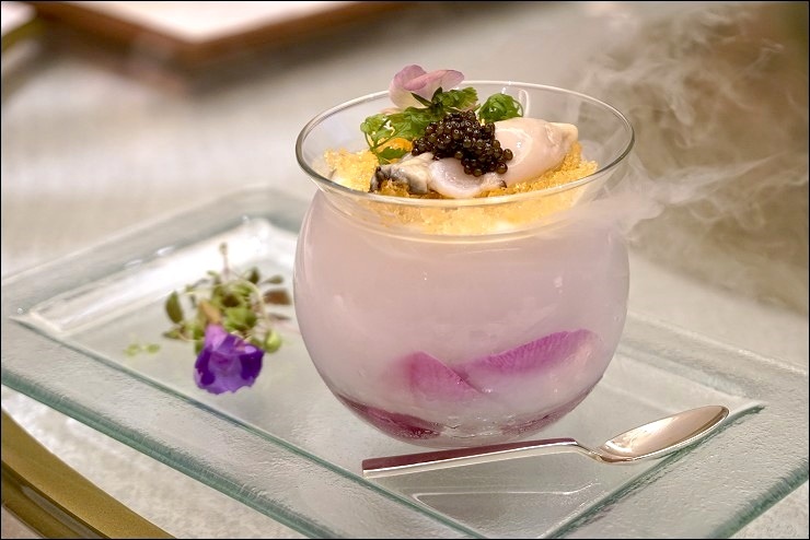 本日菜單參考,有好幾道都很喜歡!包括這兩道涼拌菜,第一個來自日本熊本生蠔,最底層是綿密化口的手工凍豆腐跟檸檬果凍,最上面是清甜爽口的魚子醬,上桌的時候容器還一直冒出白煙,餐廳花招真的很多!下面這盤上面有露珠感的冰菜,聽說是高經濟價值的蔬菜,口感很像石蓮花,台灣只有澎湖有產的樣子,這兩道都很適合夏天吃,相當開胃!