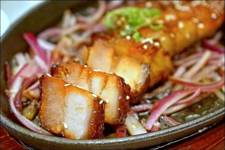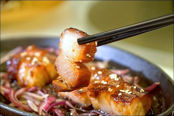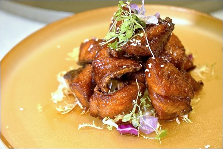 接下來幾道口味比較重一些,尤其是第一道牛肋骨,有灑孜然粉,我超愛這道蜜汁果木煙燻魚,嘗來完全不乾,酥脆到不行,利用蘋果木煙燻桂花魚,每一口都飄散果香...蜜汁燒腩肉叉燒,使用使用4肥6瘦的美國五花腩,他的蜜汁不會讓人感覺到膩口,有肥有瘦口感很優,這道瘦子凱莉哥完全不碰,個人覺得她損失慘重(我樂於接收),最後這道南瓜濕奶油炒蝦球是主廚的拿手絕活,錄影時特別選這道,還利用雞蛋絲與南洋咖哩葉來點綴,真的非常好吃!