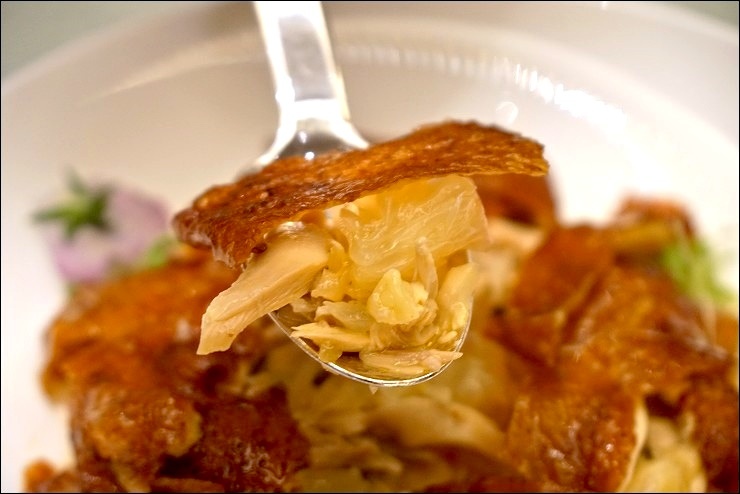 柚子蜜脆皮手撕雞,小虎稱讚到不行的手撕雞,這脆皮絕對是重點!瘦子凱莉哥又不吃,她的人生到底活著為什麼?!柚子的酸甜剛好可以解肉的膩,完美!