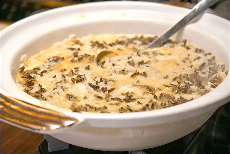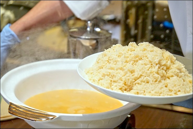 主廚親自表演這道脆野米濃蝦湯鮮蟹肉帶子泡飯,來自加拿大的野生長米聽說是米界的黑金,口感吃起來是脆的,凱莉哥大愛!完全不掩飾對這道料理的喜歡,還追加再追加,根本愛的主打曲,要不是沒時間讓她好好吃,她應該可以解決這一大鍋!