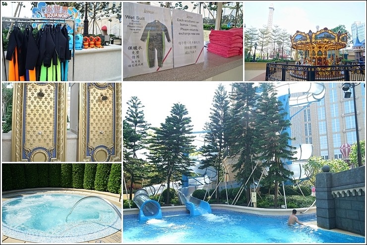 喜歡玩水的人這裡也有付費的水世界可以暢玩!平日每人160港幣、假日180港幣,一歲以下小童免費,地點一樣在六樓,在戶外就近可以看到風車與鐵塔,螺旋式的水上滑梯有身高限制,要122公分以上才能玩喔!