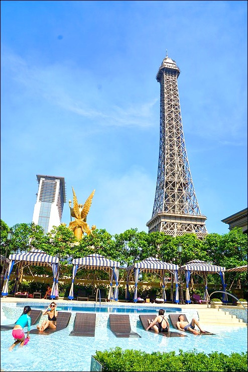這次去澳門第二晚住在澳門巴黎人的行政套房,光check in就不必在一般大堂人擠人的分流,貴賓廳全天候提供點心水果飲料還可以上網上廁所,整個非常舒服。行政套房備有腳底按摩機與浴鹽等,我們的房間坐在淋浴間就可以看到閃亮亮的巴黎鐵塔,這樣怎麼專心沖澡啦> <!然後他的中餐廳御蓮宮非常好吃,大家都覺得有摘星的水準,同行的凱莉哥大讚這是她這輩子吃過最好吃的海鮮泡飯!整個眉飛色舞,愛到不行哩~~巴黎人館內親子設施有夠齊全,包括需另外付費的Q立方王國兒童地帶、水世界及依原建築物一半大小興建的巴黎鐵塔,基本上,下午可以選擇玩玩水或在室內兒童樂園玩(有溜滑梯、球池等),晚餐建議在御蓮宮享用,最後再登高上鐵塔賞夜景,夏天這麼熱,就是要完完全全待在飯店內玩耍才是王道啊~~
