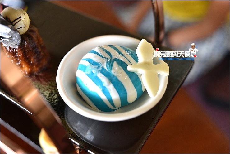 大人套餐的蝶豆花愛玉賣相超可愛,檸檬滴到愛玉裡面,會從藍色變成紫色,好吃又好玩!
