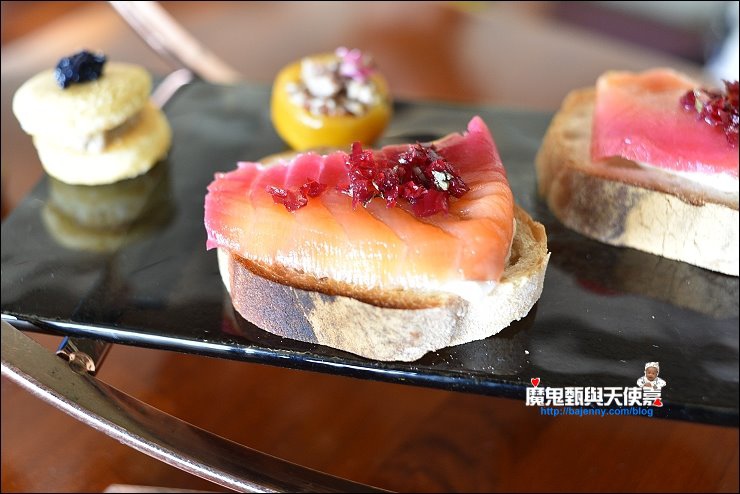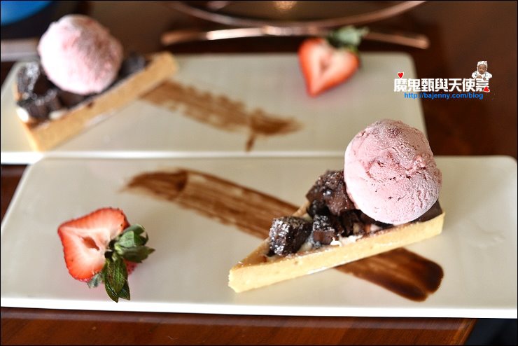 入口右側是服務人員幫忙夾取的甜點櫃,每天每桌還會輪流分派現做熱呼呼出爐的蛋塔或芝司胡椒餅(每天一種,輪流),蛋塔真的好吃!就是份量大了點,吞一顆就GG了....如果想多試幾種甜點,要小心蛋塔攻擊!當天吃到的幾種甜點都不錯,這裡還有貼心標示甜度表,因為種類不少,不知如何選擇時建議請服務人員推薦最快,鳥大叔最推馬卡龍和可麗露。