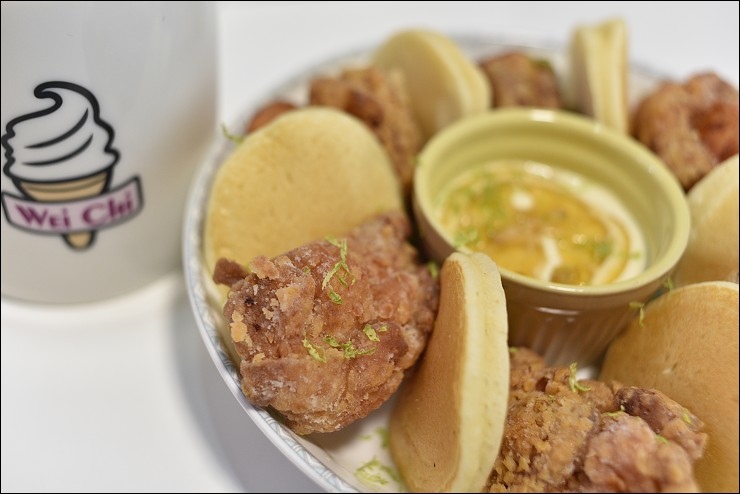 2016冬天微淇最新推出的日式炸雞鬆餅,強哥透露炸雞的醃料是採日式醃法,利用簡單的醬油、酒、蒜泥跟薑泥,醃製5個小時以上,然後還要經過兩次油炸,第一次炸熟,第二次則是炸酥逼油,雞腿肉都是當天到市場購買,因為是新鮮的肉帶點薑蒜的味道,就很有日式風味。