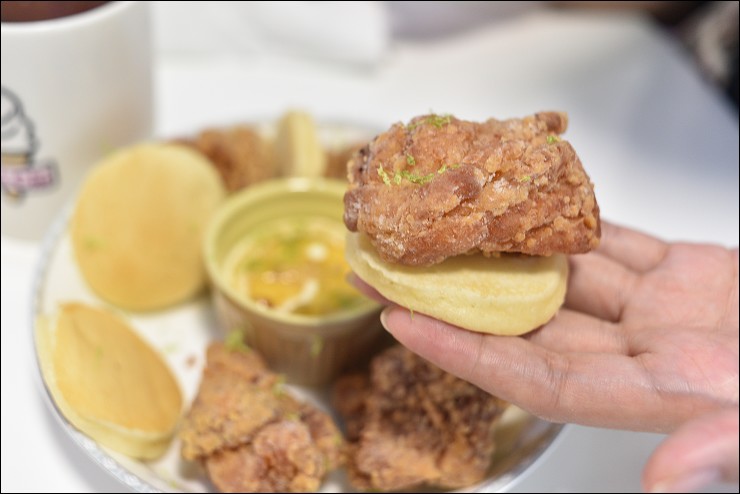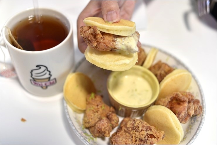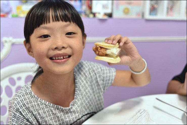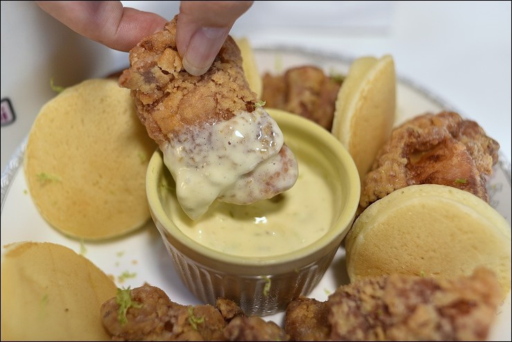 我跟小孩都忍不住直接用手拿著吃,炸雞味道不會太重,皮酥肉嫩,再沾點醬汁滋味更加豐富,附的醬汁就是微淇招牌的檸檬起司醬,利用檸檬汁加上蛋黃及法國鐵塔牌的奶油起司調和而成。自己動手做迷你炸雞堡,將鬆餅充當麵包堡上下夾住,小巧可愛,連妹妹都可以輕鬆駕馭一個,新鮮感十足又美味!