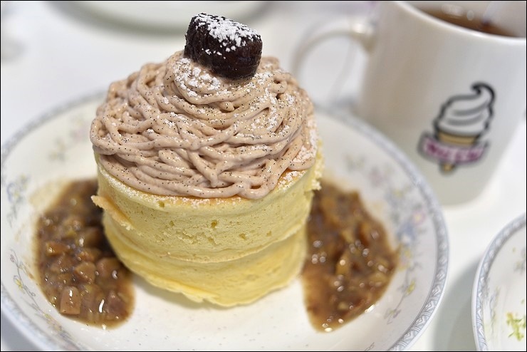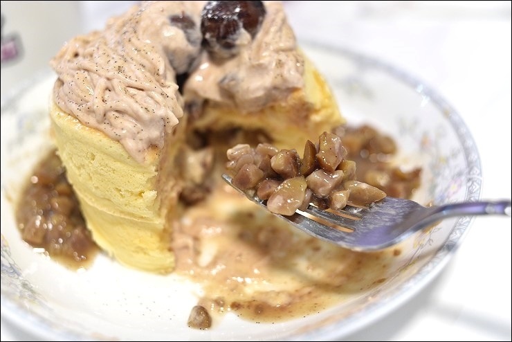 10~12月是栗子季,千萬別錯過蒙布朗舒芙蕾鬆餅,兩層半熟軟滑的厚舒芙蕾鬆餅堆疊超無敵之外,夾層還有使用香草莢及蘭姆酒熬煮的香草栗子醬,最上方放上兩顆完整帶皮的鬆軟栗子(一顆藏在正下方),再搭配使用栗子泥及法國鐵塔牌的動物鮮奶油一起打發的蒙布朗栗子鮮奶油,要趕快吃喔,不然鮮奶油很快就化掉,吃到最後真的不知該說什麼的幸福啊!