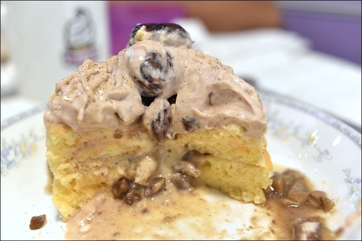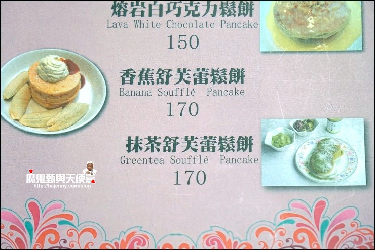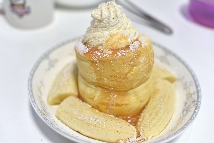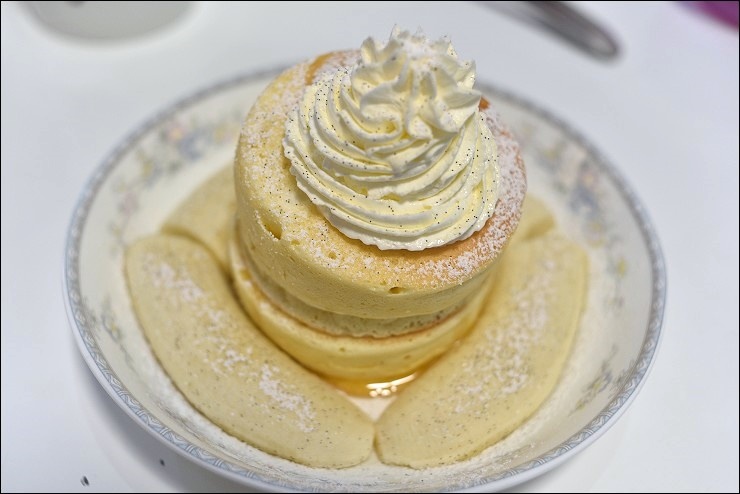 現點現作要等上20分鐘的舒芙蕾鬆餅絕對值得!利用蛋糕的方式來作鬆餅,不論是淋上抹茶鮮奶油淋醬或是搭配蜜紅豆或抹茶凍整個都很合!抹茶醬要淋滿蓋滿才行!大家極愛抹茶凍,單吃就好涮嘴,蜜紅豆稍甜一定要與軟綿綿輕飄飄的鬆餅一起入口,秋天會有季節限定的蒙布朗舒芙蕾鬆餅也很推!另外焦糖香蕉舒芙蕾鬆餅也是我家小孩狂愛的一道!