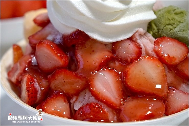 下面的雪花冰會視主要水果來配對,如果點草莓下面就會是草莓雪花冰,現在雖不是草莓季,強哥說店裡有兩台400公升的冷凍櫃,專門存放冬天的苗栗大湖草莓(夏季末會冰芒果還有荔枝),讓大家在夏季也能品嘗到酸甜幸福的草莓,另外就是不信任外面買的,都自己洗自己冰,並因應草莓的酸度,草莓雪花冰磚的牛奶有比其他口味的下的重一些,藉此降低酸度,所以草莓雪花冰最綿(冰是一片一片的雪花),其他水果因為甜度夠(如西瓜),是直接用水果做成雪冰(冰比較細粉,接近剉冰的口感)。