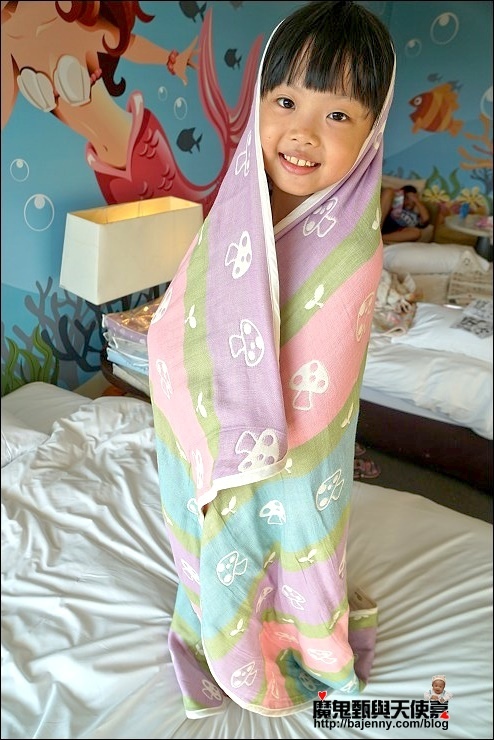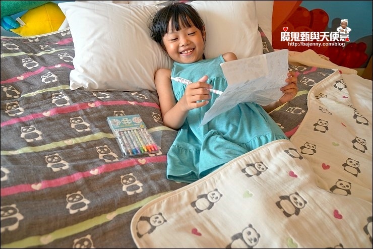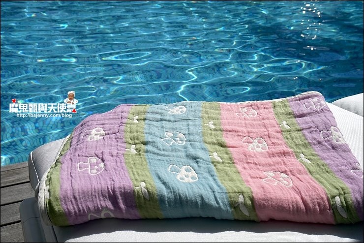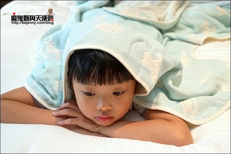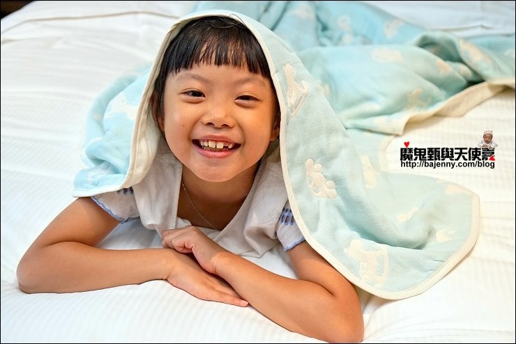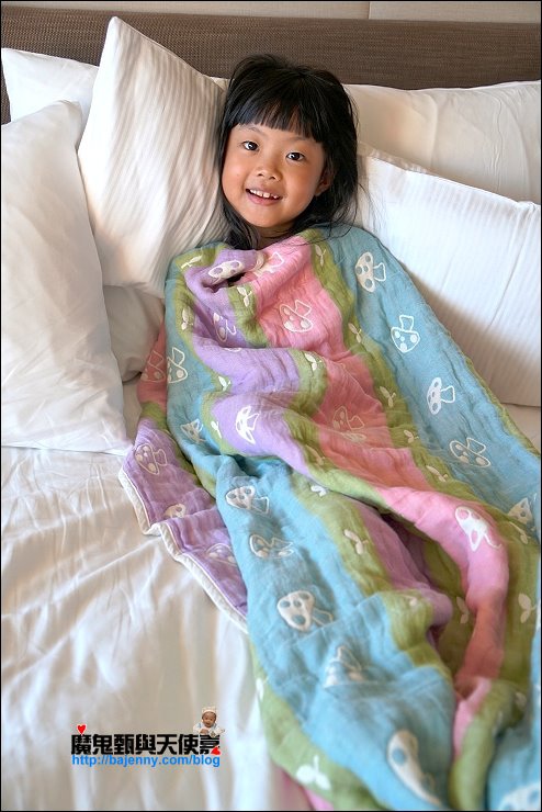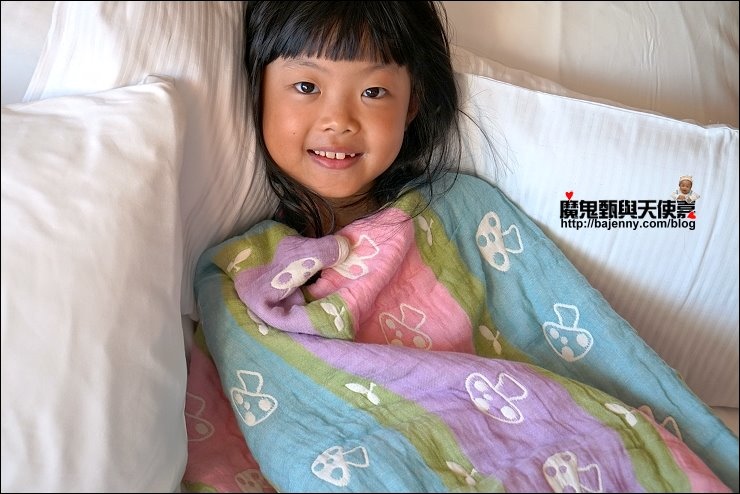 很多人出國或去飯店習慣會帶自己的枕頭棉被,尤其飯店被單上的塵蹣清洗較困難,很多媽咪會直接把紗布被墊在床上使用,然後飯店的被常常厚又重,小朋友容易蓋不住,整夜表演無影腳給你看,紗布被既輕又薄好攜帶,外出隨身帶一條好實用。在家裡不論看電視或小朋友不小心在遊戲室陣亡,也都可以拿來擋著用!像這次去日月潭雲品,妹妹自己就找個角落吃起零食來,又墊又蓋的,整個過很爽。