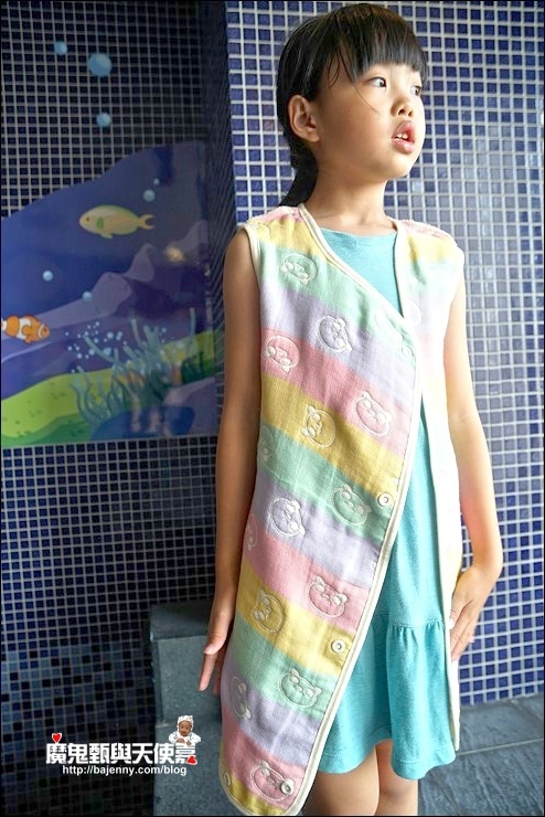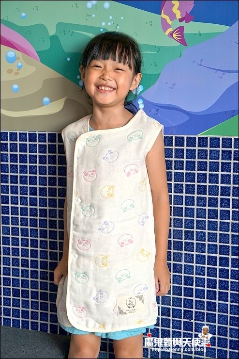 防踢背心一樣是六重紗材質,底部下方多一個扣子的貼心設計,是他們創新的概念,因為很多的防踢被,會隨著小朋友睡覺翻身時往上捲,扣住以後會形成有褲管的作用,防止睡夢中往上翻露出肚肚來,有厲害!可惜這次背心沒有貨,妹妹身上這件是L SIZE的,她125公分都還能穿,還有S跟M的,小姑已經order一件阿弟的,穿上就不用怕他們整晚沒蓋被了!