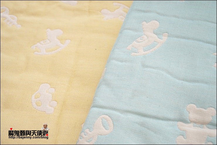 妹妹喜歡湖水藍,我喜歡暖陽黃,這款花色比較中性,上面圖案有搖搖木馬、熊熊、車車、月亮跟鑰匙,比較不分男女,這花色賣完就不會再出喔,趁著這次特價大家好好入手感受一下六重紗的超透氣無存在感!