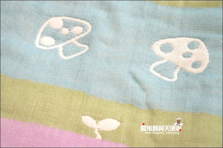 M的大小很適合妹妹蓋(帶出門超方便),馬上被她拿來當公主披肩,小女孩很愛蘑菇花色,她還看得很細,發現蘑菇有分白底跟白邊兩種,覺得很特別^^