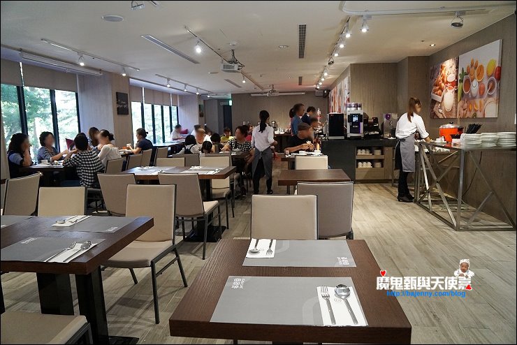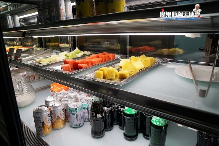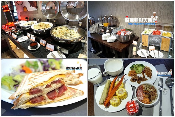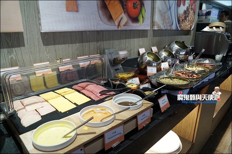 隔天睡飽飽再到二樓享用早餐,早餐有生菜沙拉、中式、西式、烤物及水果等等。自助式烤吐司可以自己加料,像是起司、玉米跟香腸,放到壓餅機,單調烤吐司立馬變身加料美味壓土司,加分不少。