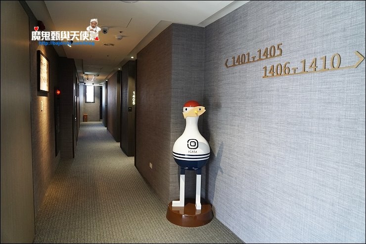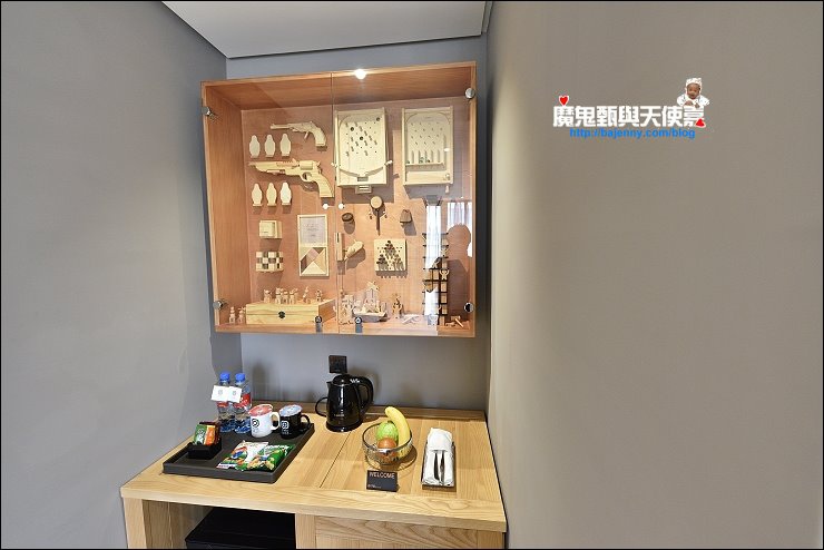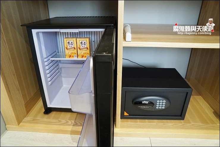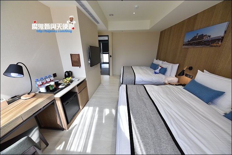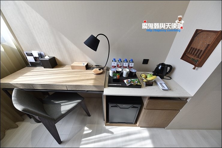 鳥大哥甄大嫂一家入住的家庭四人房,二大床超級大,書桌連著備品桌,備有四罐礦泉水、茶包、咖啡包、快煮壺、還有二包零食與迎賓水果,底下的冰箱有二罐飲料,右方櫃子裡有小保險箱及手電筒。仔細看,這間房也有個小型彈珠台哦,只是掛的位子不太方便玩就是。對了,天成文旅有提供一些簡單的小配備給房客使用,像是SAP美腿機、美容蒸臉機、乳膠記憶枕、兒童推車等等,不過數量有限需要跟櫃台預約。