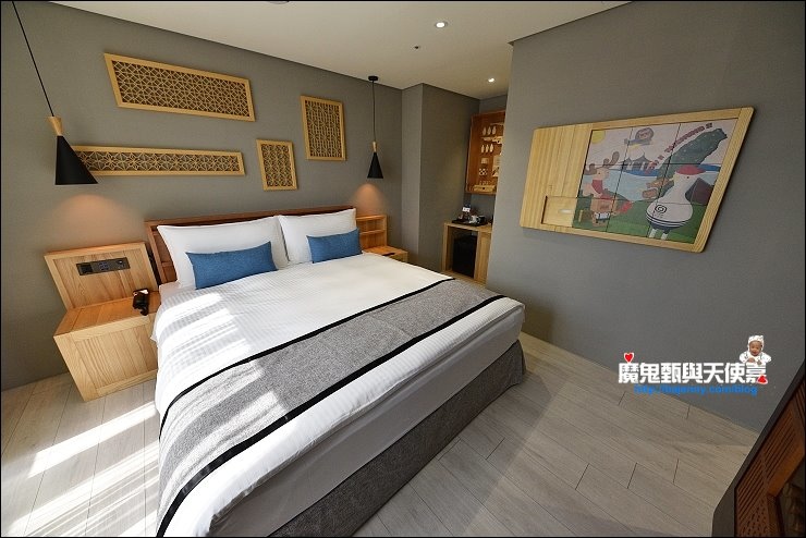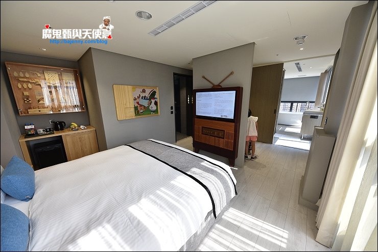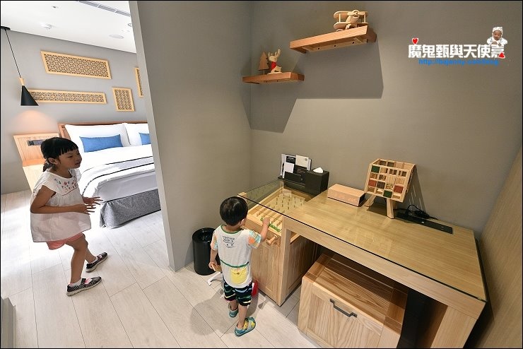 這次小姑我帶著小阿弟與甄大嫂一家同遊,入住房型是家庭房(四人房)及主題房(雙人房),主題房一進門就讓大人小孩都哇哇叫,設計很多巧思的房間耶!野馬妹發現牆面的大拼圖可以用手移動耶,旁邊茶水區上方還有原木的小玩具。我也喜歡床頭櫃就有所有的燈控及空調按鈕,連要開關浴室的燈都不用起身,舒舒服服躺在床上就能操控,最合我這個懶媽媽了!要稱讚一下天成文旅的床夠大(應該是Queen Size),二大一小睡也不會擠,床很舒服,枕頭也給夠多,四大顆外加二顆抱枕,我家甄大嫂一個人就要三顆也很夠用。