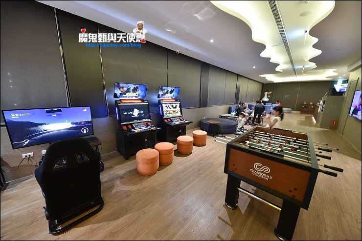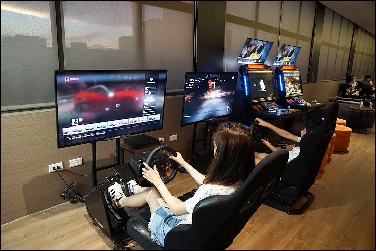還有雖然房間很舒服,但千萬不要待在房間混太久,記得上RF最高樓星空回廊來玩樂,這根本就是大小孩允嘉哥跟野馬妹的天堂,遊戲區有賽車、擂台賽、射飛標等隨你玩,完全不用投幣花錢,全部免費給你玩爽爽,還有古早味餅乾糖果跟水果及飲料自由吃,19:00~21:00加碼啤酒免費暢飲,還有房客從逢甲夜市買小吃過來配,好會哦!