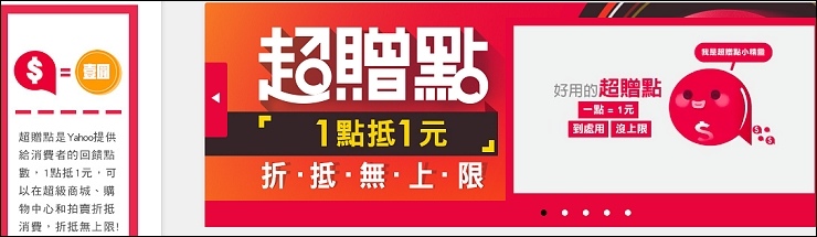 另外,用Yahoo聯名卡的消費送的超贈點,一點就等於一元,在Yahoo超級商城、Yahoo購物中心及Yahoo拍賣的消費都可以十足折抵。像我老同事喜歡趁Yahoo購物中心的保養品打折時買來屯,價格比百貨公司週年慶還優惠,不用出門去跟人家排隊擠破頭,輕鬆在家滑手機上網就有便宜好康可撿。
