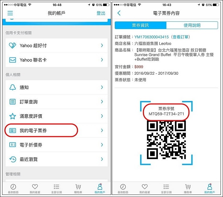 最近發現Yahoo超級商城也很多優惠,像這次入住台中天成文旅,就是從Yahoo超級商城訂的住宿券,週日~週五都可以入住,價格很划算。還有其他像是義大天悅及義大門票等,比到現場買還便宜!然後也有很多星級飯店的餐券,像是剛才有介紹的六福萬怡酒店敍日餐廳主餐+Buffet吃到飽,還有CP值很高的12廚、美味評價不錯的君悅飯店及中部日月潭、南部高雄等飯店餐廳都有。手機點進Yahoo超級商城App,刷卡下單成功直接取得電子票卷序號,購買後不需再額外列印購買證明,到餐廳直接出示手機內的票券序號或QRcode即可,環保又便利。