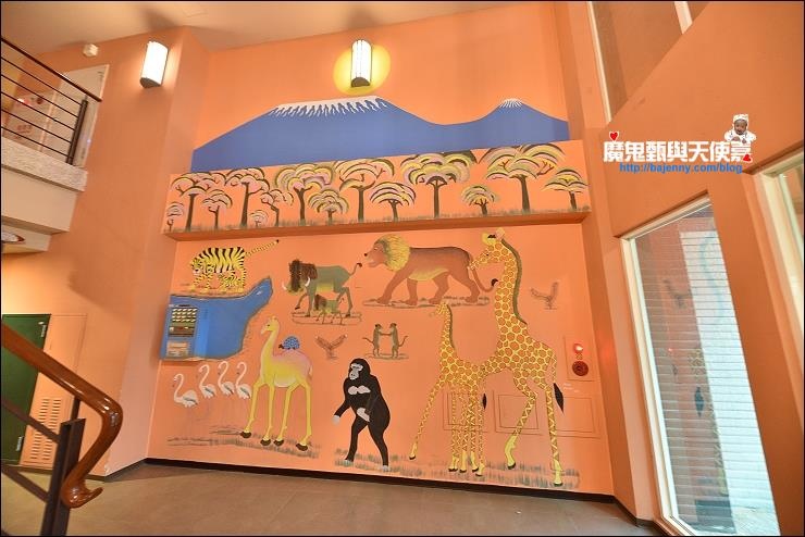 野馬妹覺得這間房間的衣架是樹木很特別,立燈和椅子都有長頸鹿的紋理,再加上動物壁畫,有住在森林裡的感覺。